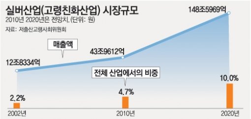 현재 우리나라 노인 인구비율을 보면 2004년 현재 우리나라 65세 이상 인구는 약 420만 명으로 전체 인구의 8.7%를 넘고 있으며, UN이 정한 고령화 사회를 지나 고령사회로 이행 중이다. 실버산업의 규모도 2002년 약 6.4조원에서 2010년 31조원, 2020년에는 116조원 이상으로 성장할 것으로 예상되며 유망한 블루오션 산업부분으로 떠오르고 있다.