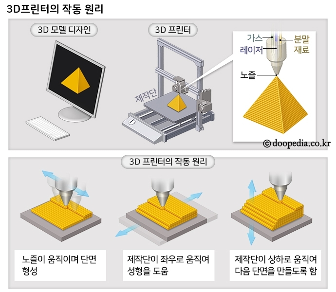 잉크젯프린터에서 디지털화된 파일이 전송되면 잉크를 종이 표면에 분사하여 2D 이미지(활자나 그림)를 인쇄하는 원리와 같다. 2D 프린터는 앞뒤(x축)와 좌우(y축)으로만 운동하지만, 3D 프린터는 여기에 상하(z축) 운동을 더하여 입력한 3D 도면을 바탕으로 입체 물품을 만들어낸다.